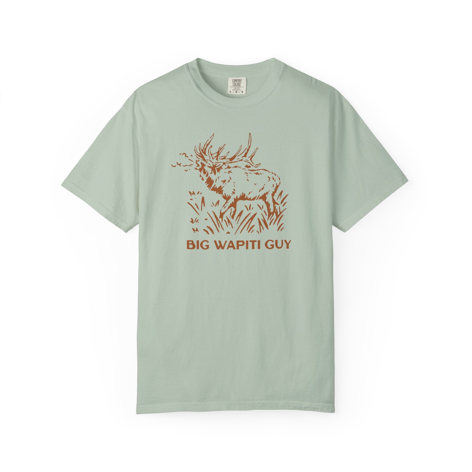 The Big Wapiti Guy Tee is a soft, relaxed-fit Comfort Colors shirt designed for elk hunters who are always thinking about the next bugle. Whether you're chasing bulls in September or repping elk season year-round, this elk hunting t-shirt delivers everyday comfort and rugged style. Perfect for hanging at camp, or kicking around town.Â